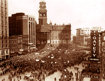 Union workers and sympathizers march toward a rally in Detroit's Cadillac Square in early 1937. The fledgling United Auto Workers were striking General Motors plants in Flint and other locations, and were encouraged when the Detroit rally drew 150,000 supporters.